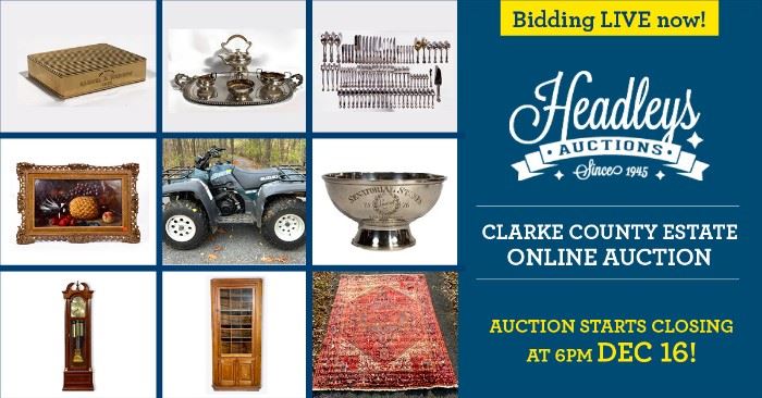 Name CLARKE COUNTY VA. ESTATE AUCTION Auctioneer Headley's Auctions Type Online-Only Auction Date(s) 12/6/2021 - 12/16/2021 This is an internet only auction. BIDDING NOW OPEN! All bidding activity will take place online ONLY. This online auction will begin closing at 6:00pm EDT THURSDAY DECEMBER 16, 2021 with lot #1. Preview Date/Time Preview Wednesday DECEMBER 16, 2021 from 2:00PM - 6:00PM AT 1689 BRIGGS RD. Berryville, VA 22611. Checkout Date/Time NOTE PICKUP INSTRUCTIONS: FRIDAY DECEMBER 17, 2021 from 9:00AM to 2:00PM AT 1689 BRIGGS RD. BERRYVILLE VA. 22611. BRING WHAT YOU WILL NEED TO LOAD YOUR ITEMS. ALL items MUST be...