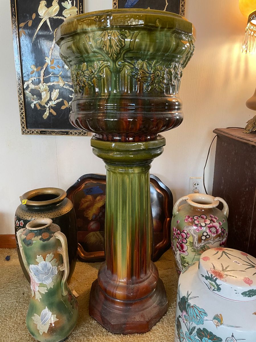 glassware, lamps, lanterns, jewelry, outdoor decor, industrial fan, ladder, Hull pottery, bird statues, Hummels, planters, pedestals, vases, angels, bedroom furniture, vintage Christmas decor, oak kitchen table, Victorian couch with pair of matching chairs, ginger jar, marble table tops, Homco, art and still so much more