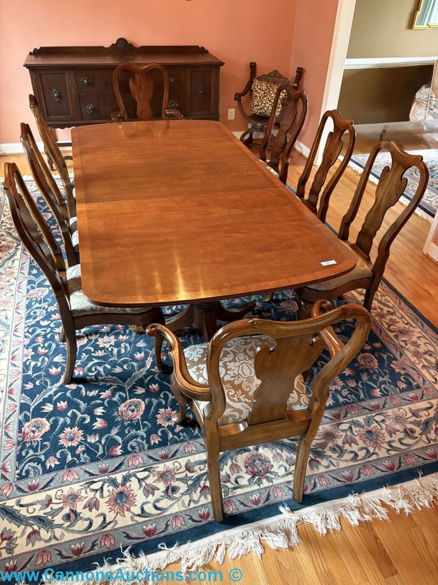 02/04: Owner Relocating | Foxwood Rd, Chester VA Owner relocating sale featuring a Queen Anne style extending dining table with eight chairs, an oak dining table with six spindle-back chairs, mahogany secretary desk, mahogany sideboard, Statton Trutype Americana sideboard with expandable top, Southwood upholstered sofa, plaid upholstered sofa, striped wingback chairs, Mid-Century style coffee table, marble-top console table, nesting tables, corner desk with shelving and chair, multiple dressers and a nightstand including National Furniture Co., sewing furniture including a Martha Washington style sewing cabinet and a fold-out sewing table, rugs including a large hand-knotted floral rug, Surya Caesar wool rug,...