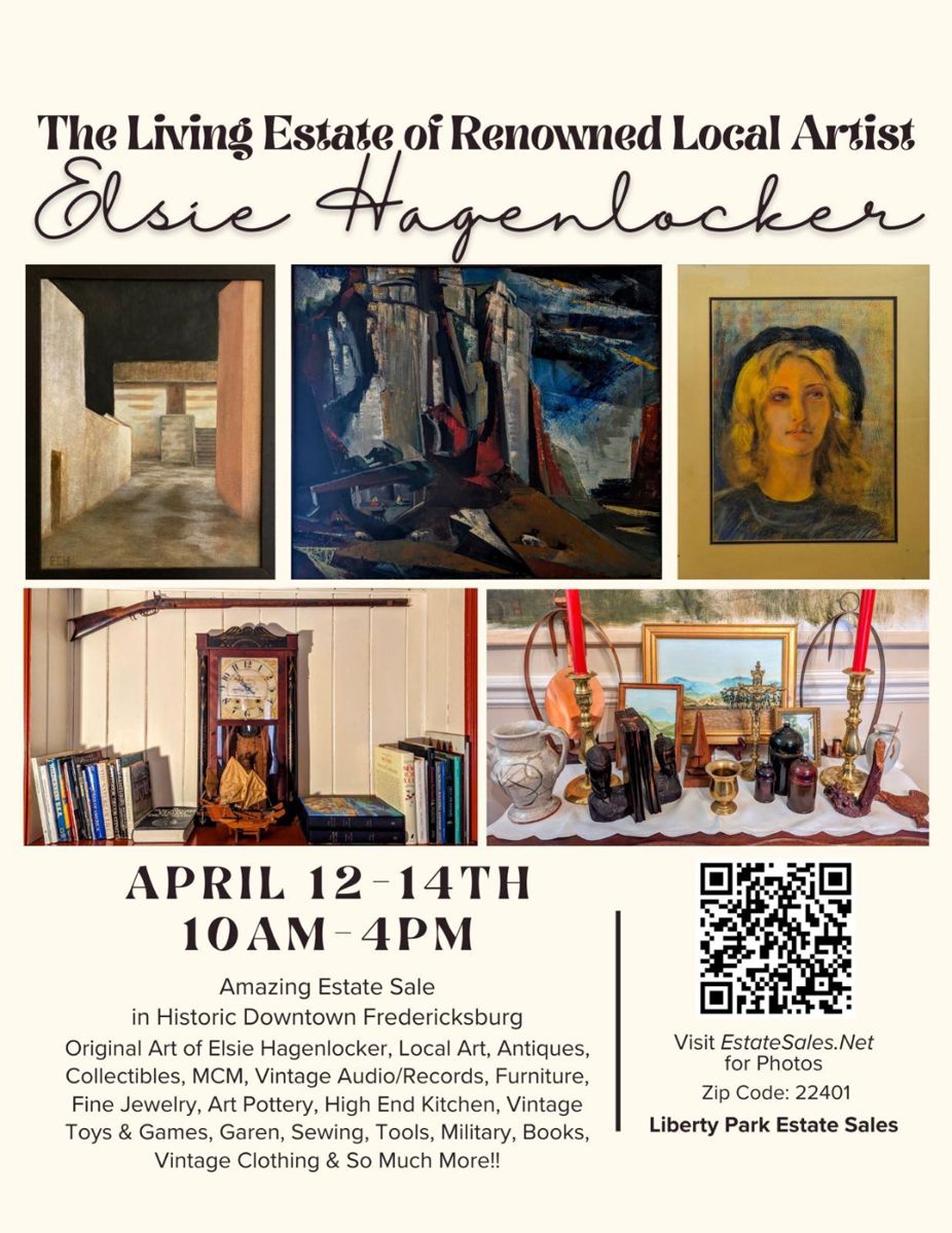 We are READY! Please read this post to the bottom!!! Here are MORE pictures! There is much more than in the pictures! The Living Estate of a Renowned Local Artist Elsie Hagenlocker ! The Collections HUGE! This Fine Estate Sale is being held April 12th,13th & 14th Daily 10-4 ! Located in Historic Downtown Fredericksburg at 810 Cornell Street, Fredericksburg, Virginia 22401. This is an Excellent Sale!!! ***Note Street Parking, Do Not Block Driveways! Form a line when you arrive. 1st in line is 1st in & so on. No numbers will be given out or recognized. We will be...