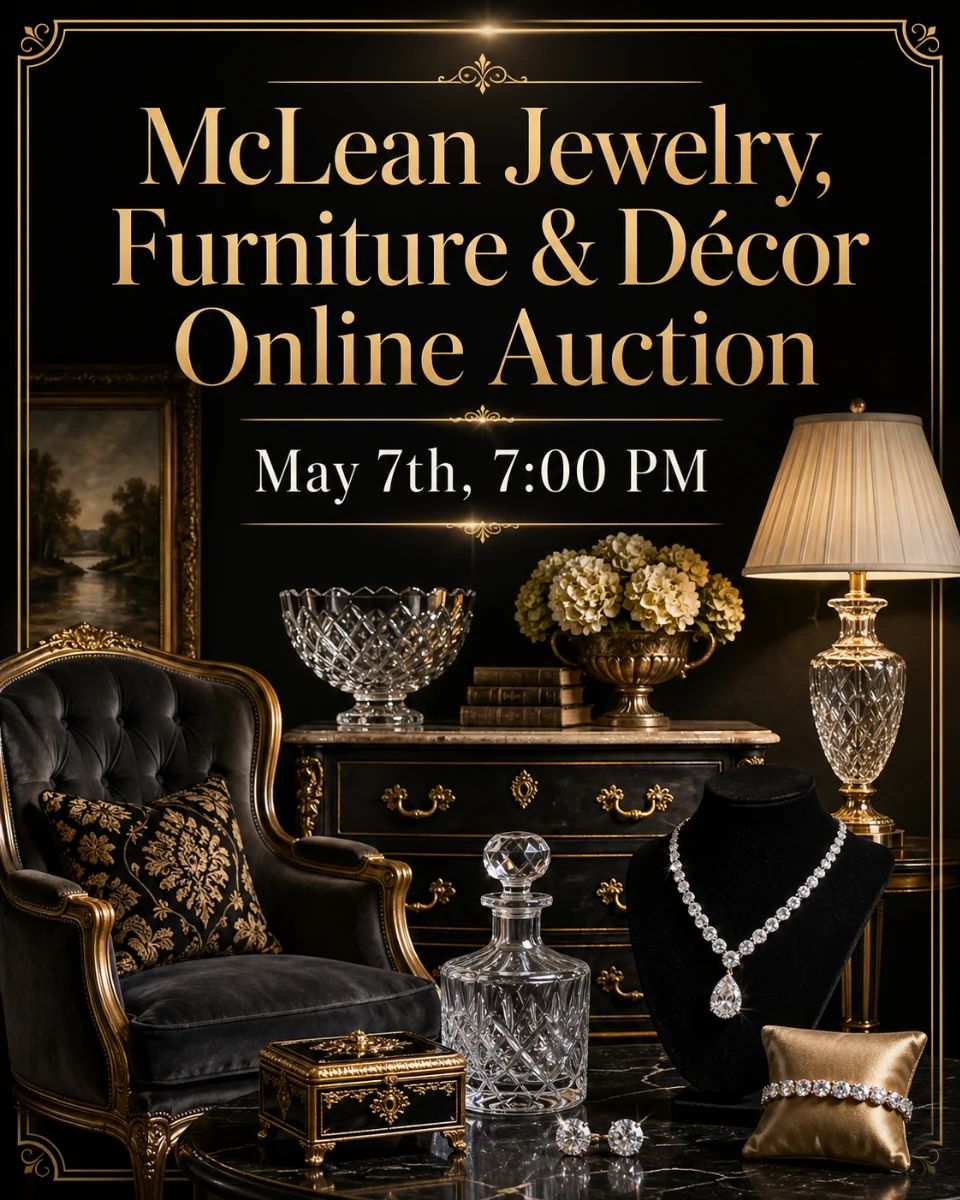 McLean Jewelry, Furniture & Décor Online Auction Auction Begins to Close Thursday, May 7th at 7:00 PM Discover an elegant selection of jewelry, furniture, home décor, collectibles, and decorative pieces from a lovely McLean, Virginia home. This online auction features a curated mix of stylish furnishings, sparkling jewelry, statement décor, artwork, crystal, lighting, accent pieces, and other beautiful finds perfect for collectors, decorators, resellers, and homeowners looking to add timeless pieces to their spaces. Highlights include fine and costume jewelry, elegant furniture, decorative accessories, framed art, crystal and glassware, lamps, tabletop décor, and unique household treasures. Whether you are furnishing...