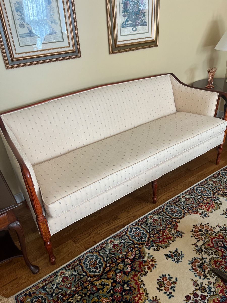 Drop Leaf Table w/ 6 chairs, Upholstered Chair w/ Ottoma, Lazy Boy Tufted Armed Recliner, Sofa, Round Coffee Table, Assorted Side and End Tables, 3-Full Beds, Chest of Drawers, Quilt Rack, Desk, Desk Chair, Barstool, Bentwood Rocking Chair, Armed Upholstered Chair, Cream Armed Chair/ Ottoman, French Provincial Desk w/ Hutch and Chair, Picnic Table - 2 Benches ( Redwood Color), 2 White Outdoor Rocking Chairs, 2 Ladder Shelves, Globe w/ Wooden Stand, Wicker Sofa, Vintage Pram, Graco Play Pen, Vintage Frosted Drinking Glassware- Currier and Ives, China – Royal Dalton Hampshire ( England), Depression Glass, Milk Glass, Silver Plated Serving...