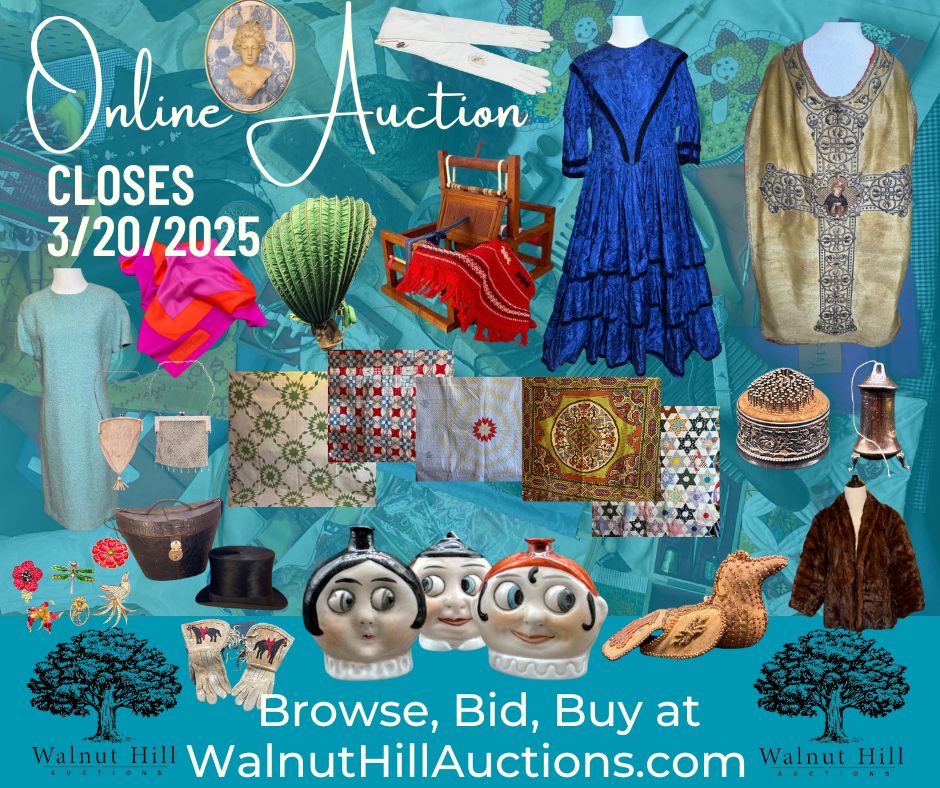A wonderful collection spanning more than 80 years! Highlights include 18th century Chausable and Dress, early 20th century, bespoke, Couture and mid-century Vintage clothing, furs, one-of-a-kind and vintage jewelry, antique purses, antique quilts, sewing tools, weaving looms, needle painting, quality fabric by the piece and the bolt, antique beds, high quality vintage luggage and briefcases, and lots still to be discovered. Items will be added to the sale up until closing so check back often!