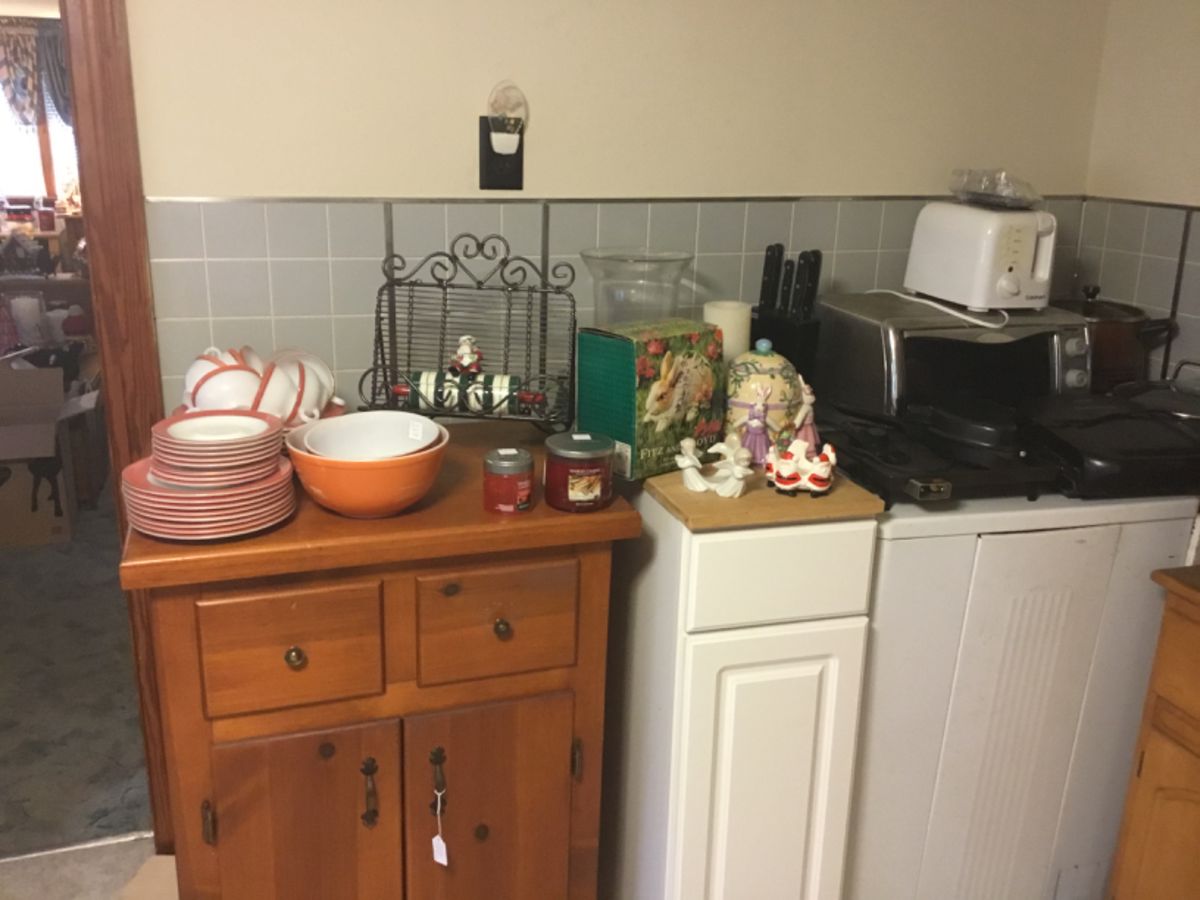 Let the bargain hunting begin! House, large garage and shed chock full of great items! Ample parking in yard and at the VFW Contemporary costume jewelry, Pyrex, Cd, dvd, Vera Bradley purses and bags including a brand new dress travel bag!, Yankee candles and accessories, Halloween, Hallmark, Snowman, Santa Clause, vintage metal patio furniture, yard art, Young Hinkle bedroom furniture, Lazy boy sofa and chair, Amish heaters, Antique treadle sewing machine, Clothes and linens, Office furniture, Credenza, Kitchen items, Correll dishes, Just a disclaimer! This is not an A Family Affair sale though the ad says it is! I set...