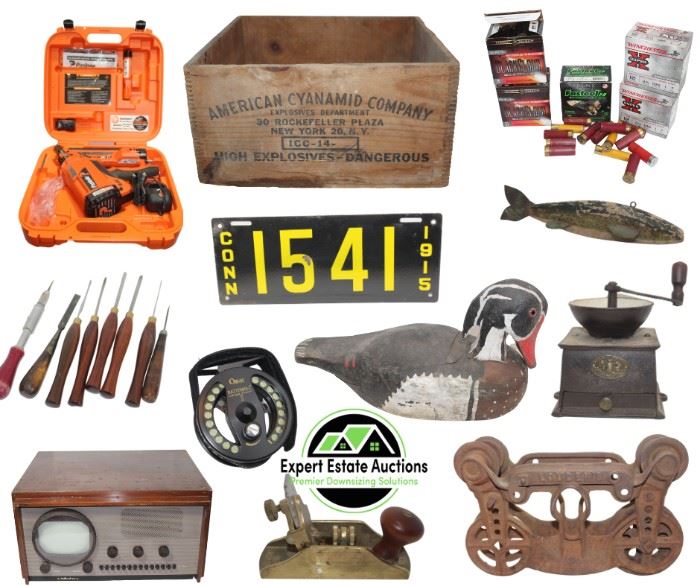 OWNER IS MOVING AND SELLING AN INCREDIBLE SELECTION OF DECOYS, FISHING, HUNTING ACCESSORIES, GUNS, MASSIVE AMOUNT OF TOOLS & SO MUCH MORE!! Over 50 Duck, Bird and Fish Decoys, many Artist Signed including John Bundy, J. Martin 1964, Wayne Williams, Tom Taber, Tim Bergren, William Westbrook, Kermit Sleeten, John Ornbey, Early Glass Eye Fishing Lures, Pflueger, Heddon, Paw Paw Wotta Frog Lure, Animal, Duck and Bird Calls, Hunting Knives, Animal Traps, Newhouse #4 1/2, Full Size Taxidermy Baby Black Bear, GUNS, Derringer 38, British Bulldog, H&R 22, American Double Action Revolver, Large Selection of Gun Frames, Cylinders, Parts, Stack On...