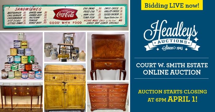 Name COURT W. SMITH ESTATE AUCTION Auctioneer Headley's Auctions Type Online-Only Auction Date(s) 3/22/2021 - 4/1/2021 This is an internet only auction. BIDDING NOW OPEN! All bidding activity will take place online ONLY. This online auction will begin closing at 6:00pm EDT THURSDAY APRIL 1, 2021 with lot #1. Preview Date/Time Preview Wednesday March 31, 2021 from 2PM to 6PM at the Home located at 2825 Saratoga Drive, Winchester, VA 22601. (All Health Guidelines Will Be Observed) Checkout Date/Time NOTE PICKUP INSTRUCTIONS BELOW: FRIDAY APRIL 2,2021 from 9:00AM to 5:00PM AT THE HOME LOCATED AT 2825 SARATOGA DR. WINCHESTER, VA...