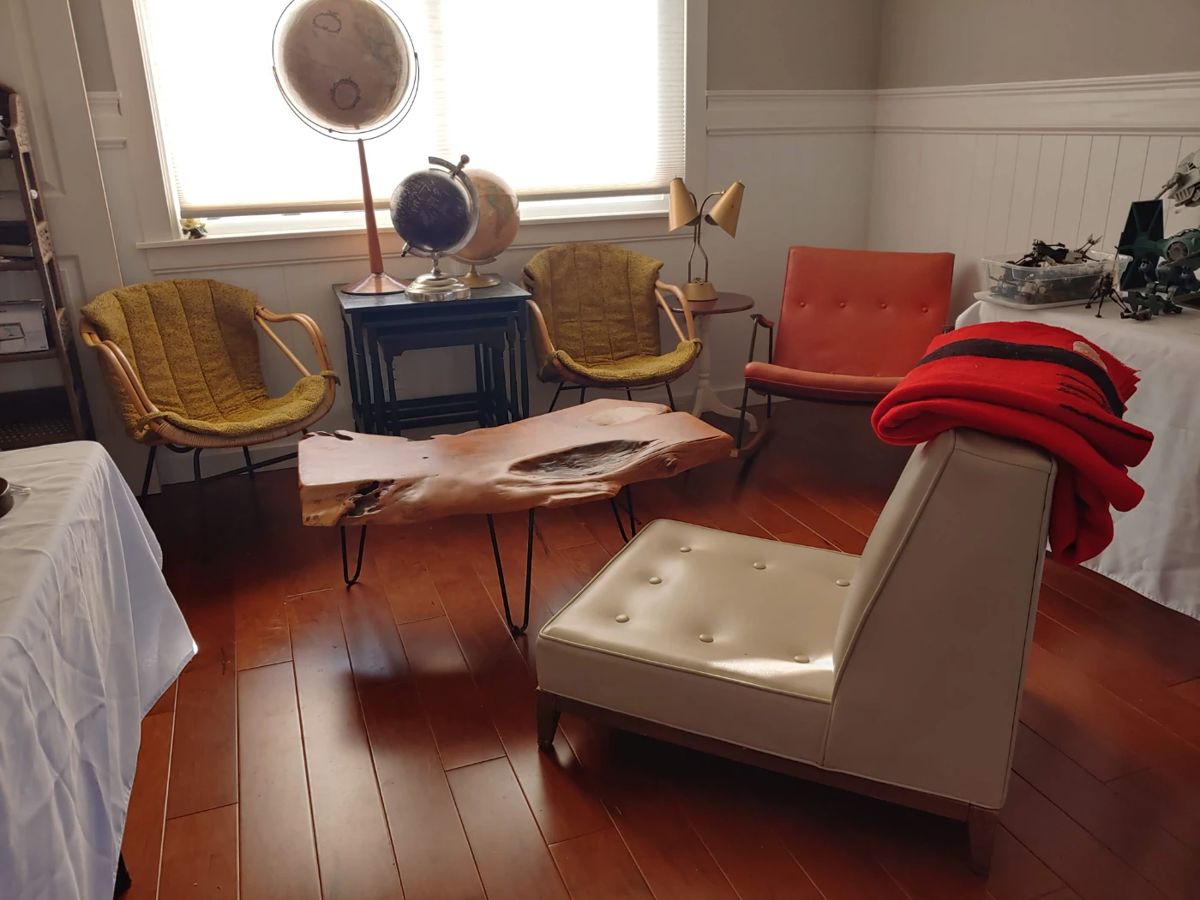 This sale features the massive inventory of a lifetime collector/professional Antiques dealer! This two story home in the Edgemoor neighborhood is packed with vintage treasure, including a gorgeous selection of Mid-Century Modern furniture and a spectacular assortment of Vintage Native American Beadwork! This dealer's inventory focused on vintage cutlery, housewares and china. It's a re-seller's dream sale! There's a set of MCM 1960's Bentwood & Wrought Iron Chairs, a Milo Baughman "Scoop" Rocking Chair, a 1960's Redwood "Live Edge" Burlwood Coffee Table, a Lane Perception End Table, an Antique Sewing Machine and cabinet, an MCM Lowboy Dresser, an Antique Hendryx...