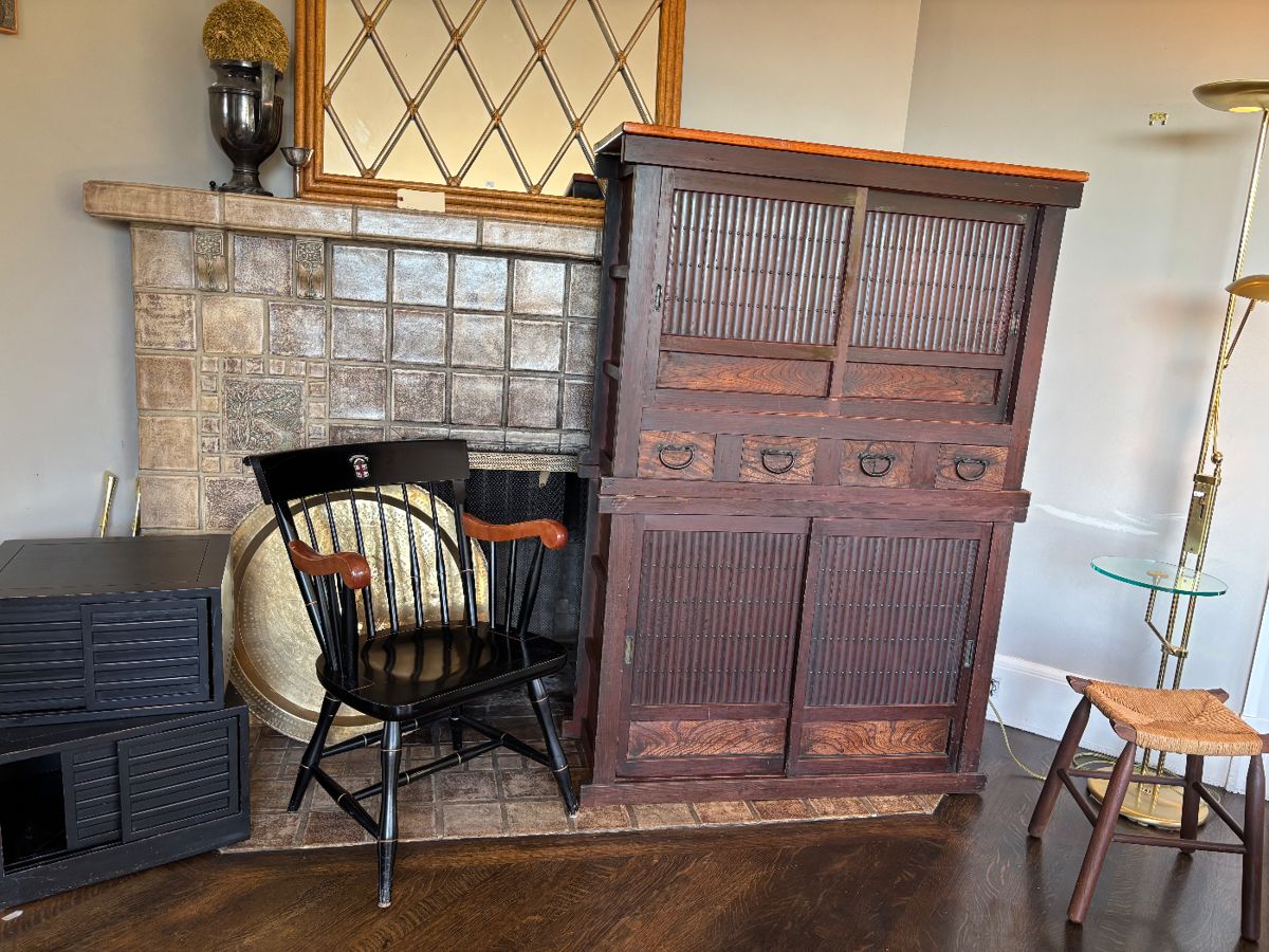 HALF PRICE SUNDAY! everything under $100 is half price today— other items discounted 20% or more. House is still very full. Come on over.!!! This is a huge sale highly currated assortment of art and design items, housewares Vintage clothing, jewlry and brica abrac so much here too much to list- highlights include: Large tansu cabinet, stacks in 2 sections 2 large antique tea canister basket lamps MCM Paul Mccobb style square metal upgolstered ottoman Bamboo floor lamp Bamboo console table 1960’s waterfall style Ficks Reed Set of four vintage white bamboo chairs by Ficks Reed Ethan Allen round ottoman...