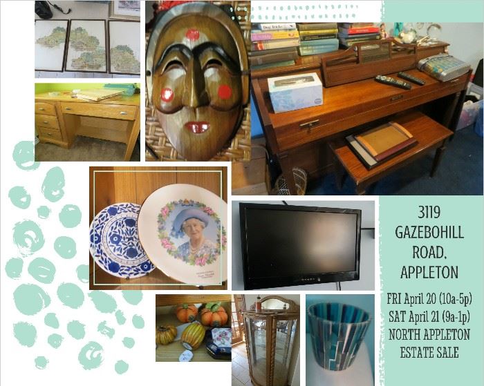 NORTH Appleton Estate Sale Address: 3119 E. Gazebohill Road, Appleton, WI 54913 FRIDAY, April 20th (10A-5P) & SATURDAY, April 21st (9A-1P) Featured Items Include: Furniture for Bedroom/ Kitchen / Living Room, L inens, Outdoor/Garden, Tools and Tool Chests, Décor, Books, Flatscreen TV's, Outboard Motor, Chest Freeezer, Toys, Piano, Shelving, Curio Cabinet, British Royal Family-Themed Pieces, Christmas Trees and Decorations, Yamaha Keyboard, Purses, Stuffed Animals, Framed Artwork, Wicker Lawn Furniture and much more!