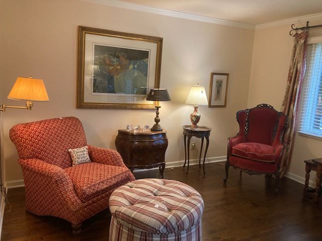 Wonderful artwork including oils, water colors and French posters, collections of trinket boxes, canes/ walking sticks and butterflies. Dennis Pearson beasties. Beautiful sideboards, dining room table with 6 chairs, area rugs, occasional chairs, settee, Baker paisley sofa, china hutch, decorative figurines, china, stemware, queen bedroom suite, wardrobe, women’s clothing/ accessories, storage shelves plus terrific household.