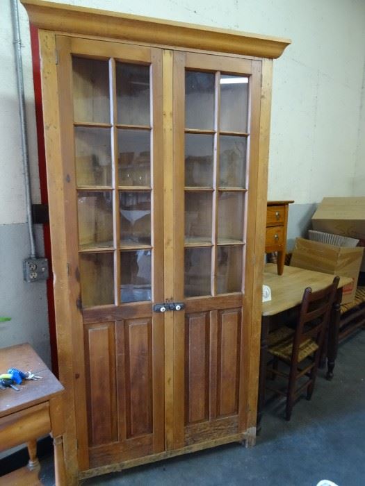 We have moved this estate of antiques from a country farmhouse in Spring Green WI. to Cambridge, WI All antiques, Items of popular request and also the rare and amazing crafted wooden folk art made in Prisons 1935- 1950. The owners collected primitive style antiques, folk art, tramp and prison art for over 50 years. This sale will feature primitive style furniture to include vintage cabinets, trunks, cupboards, harvest tables, pottery, baskets, farm tables, chairs of variety, Old Hickory style benches, windmill weight of the letter "W", some prison art fern stands and tables . Eastern Hickory bent rockers General...