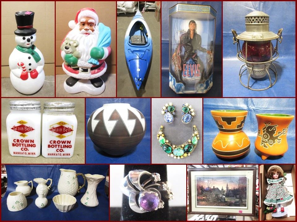 BLOW MOLDS, KAYAK, JEWELRY & ANTIQUES ONLINE ONLY AUCTION Located at the Hines Online Facility – 107 County Rd C Ellsworth, WI 54011 STARTS ENDING MONDAY, APRIL 6th @ 6:30PM OPEN HOUSES: Monday-Friday 9am-5pm SALE INCLUDES lrg asst of vintage blow molds inc Santa, snowmen, choir & more• Colonial walnut grandfather clock• Perception Sport 9.5ft kayak• Honda HRX 217 mower• animal figurines• Pittsburgh Original & World Gallery dolls• antique brass bells• daguerreotype photos• Capodimonte flowers• music boxes• custard glass berry bowl set• Fenton• Incolay plates• brass decor• vintage records• Elvis collectibles• Belleek• Barclay toy soldiers• belt buckles• woodworking tools• decanters•...