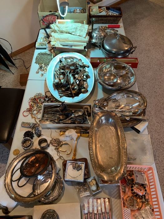 Estate Sale 5825 Holscher Rd. McFarland, Wi 53558 Dec. 19,20,21 (Thursday-Saturday) 9-5 Large amount of Victorian, Danish MCM, gold and sterling jewelry. Many mens and woman’s watches Beautiful selection of late 1800’s early 1900’s dresses, handmade lace, silk taffeta, Victorian notions, turn of the century fabric, burlap hook rug blanks, Antique flatware, serving pieces 7 antique trunks 30 Audrick handmade & signed pool cues / cases Limoges Haviland MCM blond desk LP’s, CD’s, DVD’s Wrought iron candle stand New leather recliner / massage chair CD tower Tea table Oak double drop leaf table Cast iron horse banks American Fostoria Oriental...