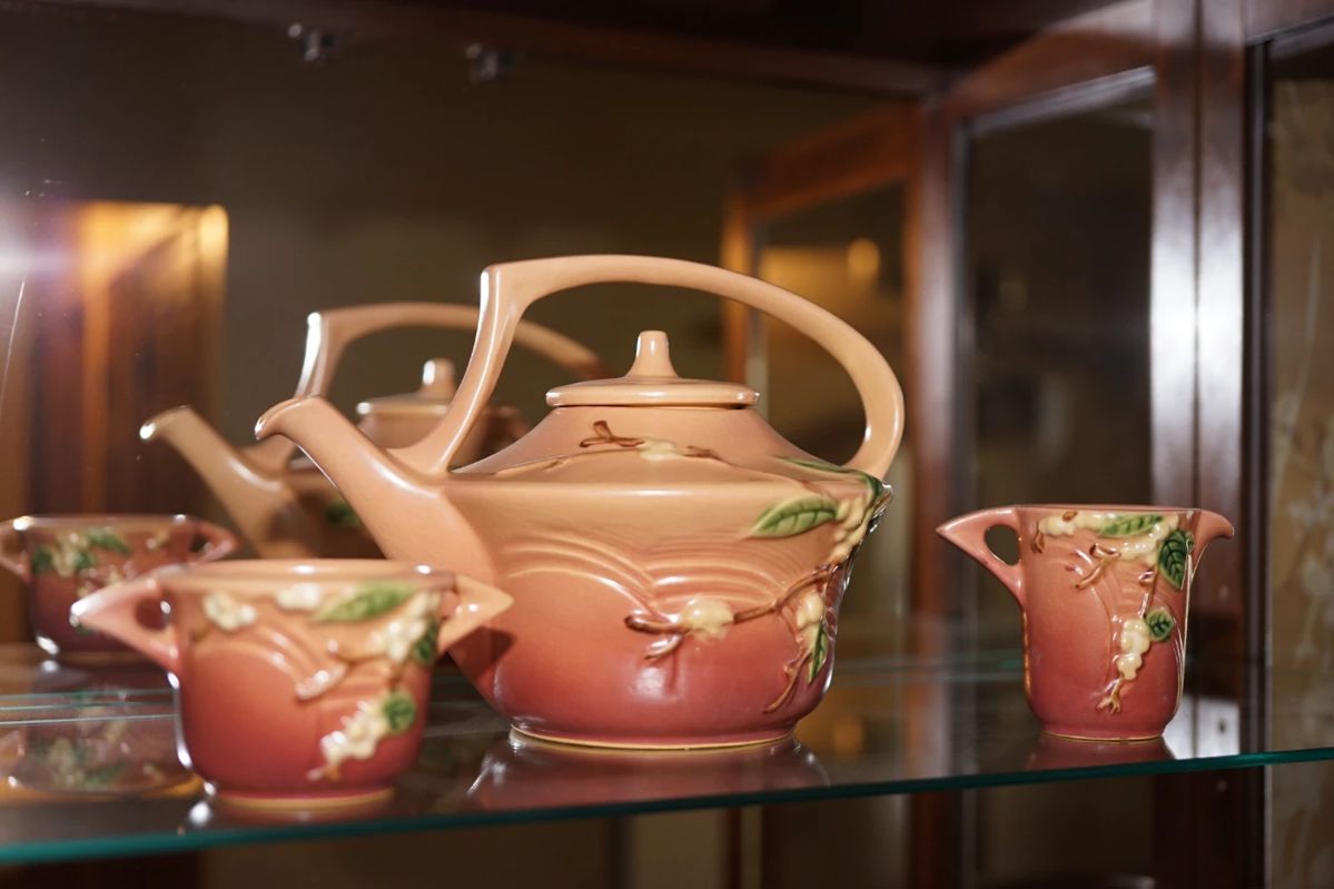 EARLY ROSEVILLE POTTERY , ANTIQUE LAMPS, ROSEPOINT STERLING, COLLECTIBLE GLASSWARE , PRINTS