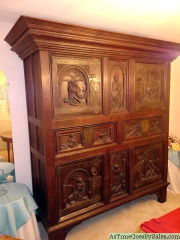 Muskego Estate Sale Sunday, May 4, 10:00-1:00 Unique items in this Muskego estate! A interesting mix of new and old. All items left will be half price. Massive antique carved oak cupboard with medieval type scenes in the Tudor/Norman style. Primitive old Swiss peasant chair and oak cabinet with Swiss folk decoration. Thomasville dining set, all-glass dining table with contemporary chairs, gorgeous antique two-door bookcase, curved sectional microsuede sofa, sleeper sofa. King bed & storage shelving, painted hope chest, antique dropfront desk, contemporary desk, painted armoire. Occasional tables, terrific wrought iron glass top table & chairs with matching baker's rack,...