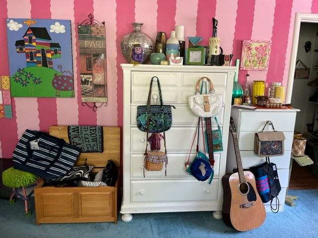 Trays full of fine costume jewelry/ beads for jewelry making, walls of original art, Dennis Pearson beasties, sticks furniture/ cabinets/ mirror, tables, decorative lamps, wall mirrors, colored art/ stain glass, sets of China, Waterford/ Ralph Lauren/ bohemian cut glass stemware. An array of wonderful knick knacks, kids/ adult books, vintage kitchen & agate stones. Closets full of fine women’s clothing/ accessories including purses, shoes, belts, scarves, and hats. Sofa/ loveseats, end/ coffee tables, leather chairs, bookcases, display China cabinets, king beds, dressers, bedding/ linens, wicker patio set, sporting goods, gardening/ carpenter tools, storage bins plus loads more. Don’t miss this...