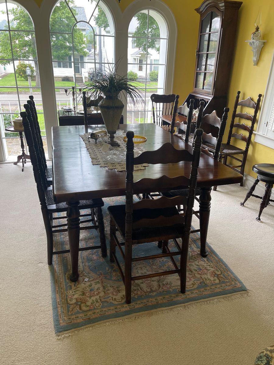 Estate Sale by The Junque Ladies!! Lovely Home with Quality Furniture Ethan Allen Farm Table with 8 Chairs Ethan Allen Tea cart Ethan Allen Secretary Ethan Allen End Tables 1930’s China Cabinet Antique Organ Stools Seth Thomas Grandmother Clock Goebel Hummels Lladro Royal Doulton Figures Wedgewood Pilgrim Blenko Lenox Waterford American Major China Walnut Curio Cabinet Antique Cast Iron Fire Box Antique Cast Iron Andirons Vintage Stereo Console Vinyl Records Gene Gray Print Handmade Quilts Area Rugs Decorative Items Longaberger Baskets & Pottery Stanley White Washed Twin Headboards with Serta Adjustable Bed Frame & Mattresses Stanley White Washed Armoire Lexington...
