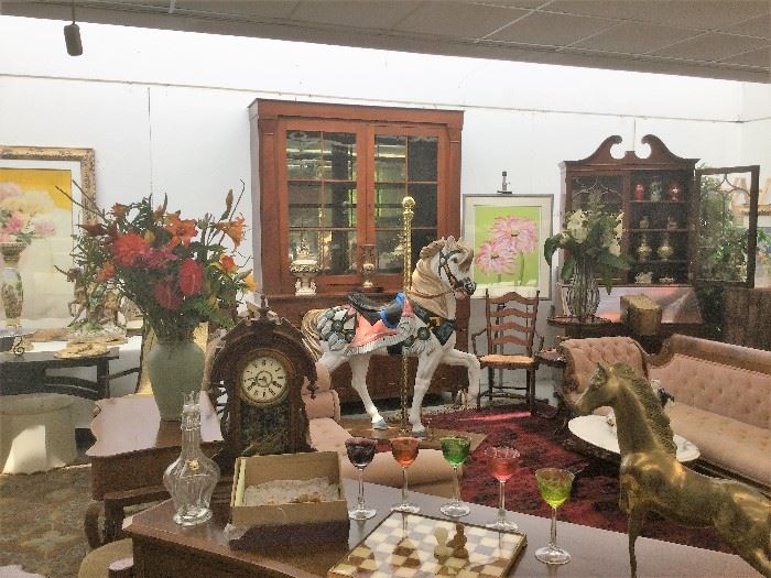High End Estate sale by M. Hall at the Huntington Museum of Art 2033 McCoy road Huntington WV Wednesday 24th through Saturday 27th 10 a.m. to 4 p.m. each day. Beautiful 1800's period cabinet, lots of Mackenzie-Dow Furniture including server, dining table, chairs, tables, stools/ bar stools, bed; antique style sofas, fainting couch, curios, desks, brass beds; Porcelain figurines, lamps, urns, compotes; Hadeland Norway Crystal, stemware, Oriental Decorative pieces, working pump antique pump organ, C & O railroad barrel chairs, nautical items, carousel horse, lots of prints and paintings, numerous area rugs, antique Persian carpet, several china sets. Gorgeous furnishings...