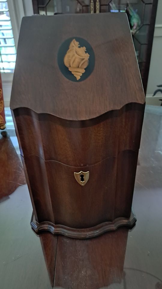 Stately knife box, a reproduction of an 18th century dining room necessity gracing the sideboards of the elite. This one is by Tradition House, Hanover, PA, a company that spared no effort to produce the finest products using the finest materials and finishes. This exceptional